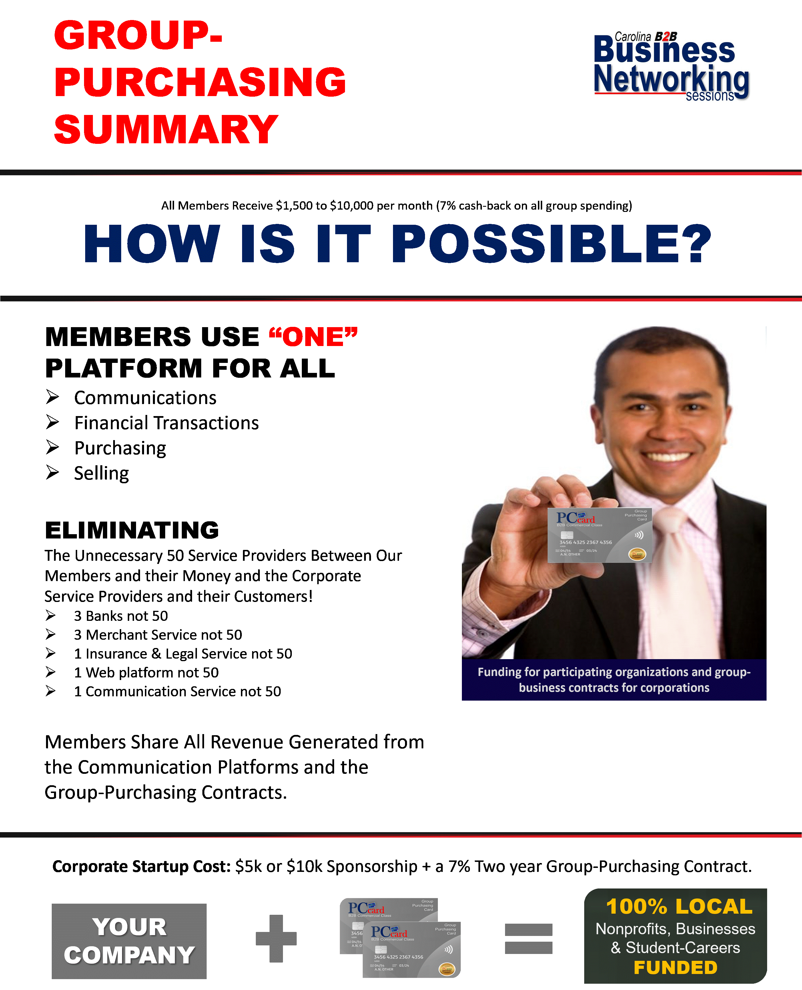 *** The purchasing card works "just-like" the air-line points system and the rebates system. The B2B groups are able to command 7% instead of the usual 1% or 2% cash-back because we guarantee our purchases of specific products for three to five years. Our members receive cash instead of points and All members share in the revolving twenty-four million dollars that is revolved through the network. Because the members are the share-holders all contracted funds are dispersed to all members based on their budgets. The network does not pay CEO's and Share-holders!